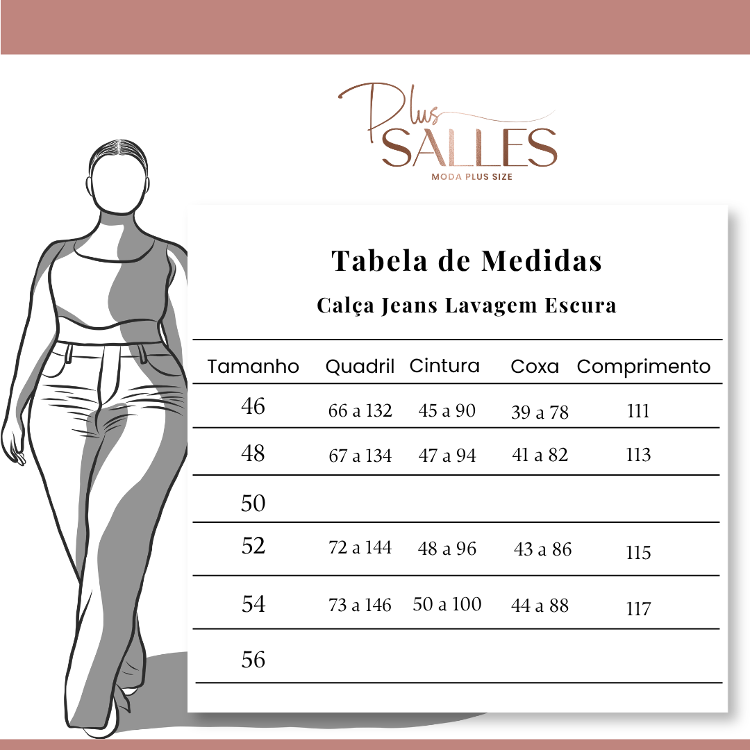 48- Cintura: 96 cm | Quadril: 126 cm | Coxa: 72 cm | Comprimento: 110 cm